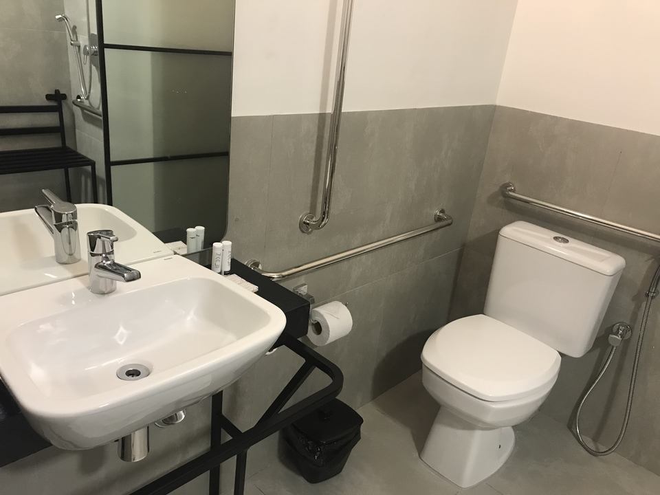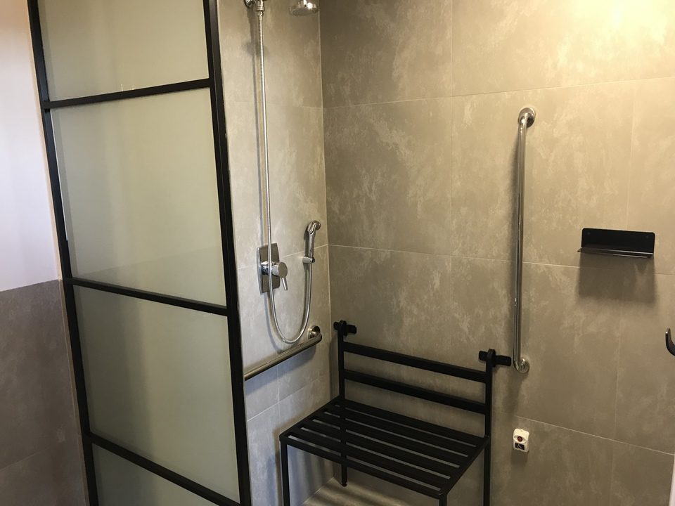 Mais espaçoso com cama levemente rebaixada e banheiro com barras de apoio e alarme. Banco para banho mediante solicitação. Aproximadamente 22m².